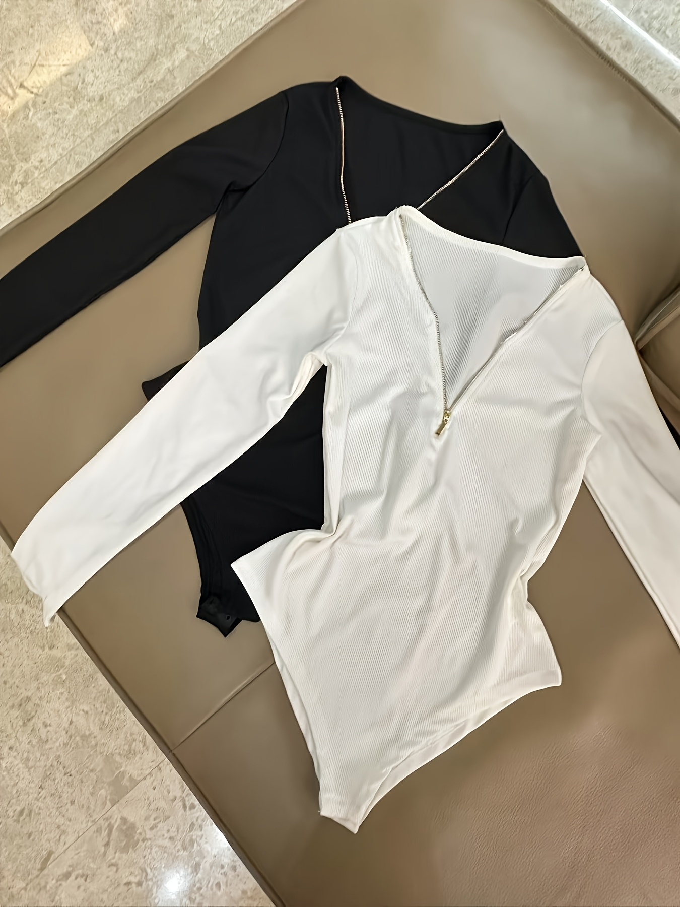Set of 3 Autumn and Winter V-Neck Ribbed Zipper Stretch Comfortable Versatile Long-Sleeve Pullover Jumpsuit