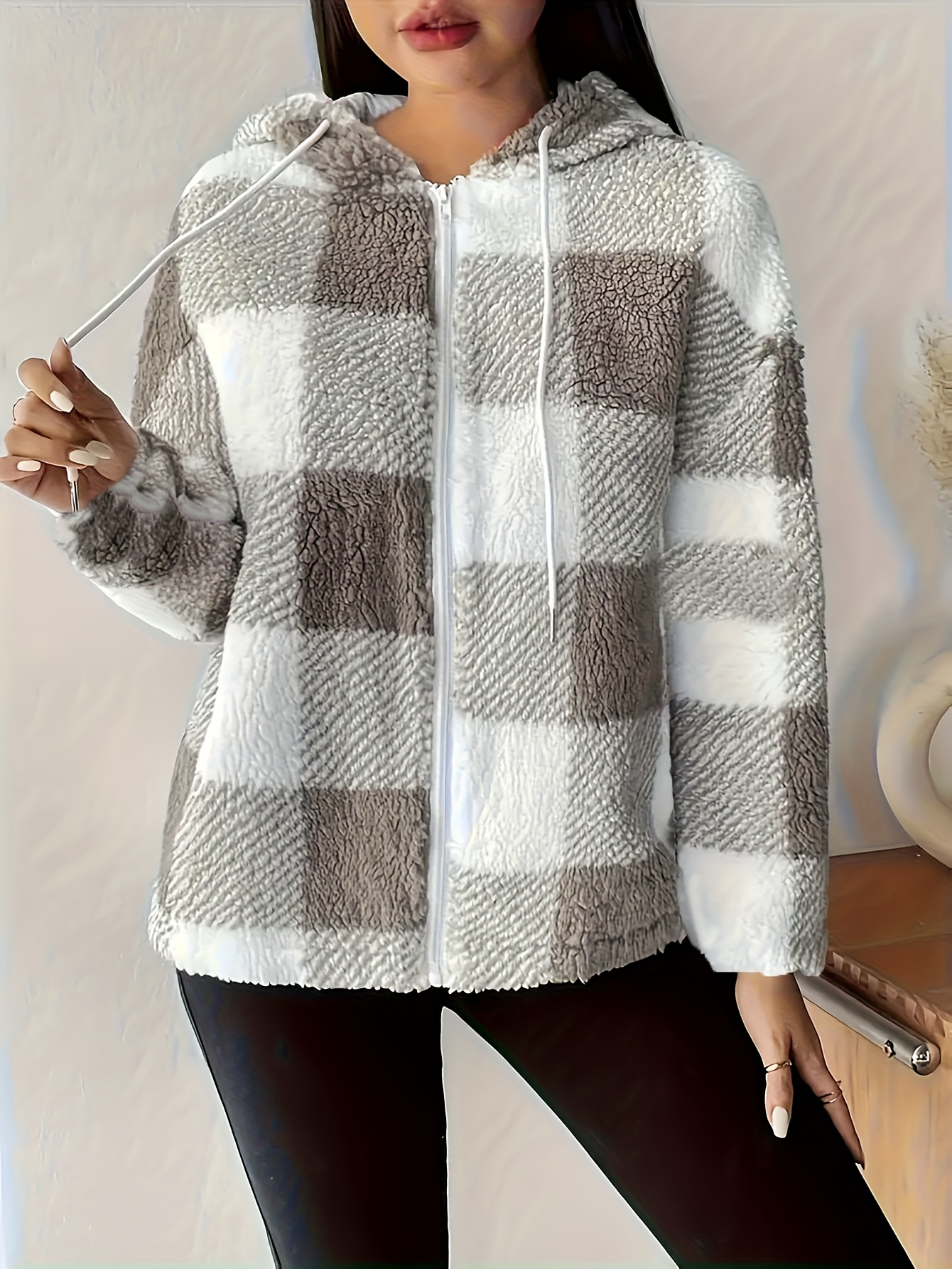 Women's Plush Coat - Non-Stretchy Beige & Brown Checkered Winter Jacket, Machine Washable Cold Weather Outerwear for Fall/Winter, Chic Everyday & Formal Events Coat, Winter Coats, Casual Winter Wear, Textured Fabric